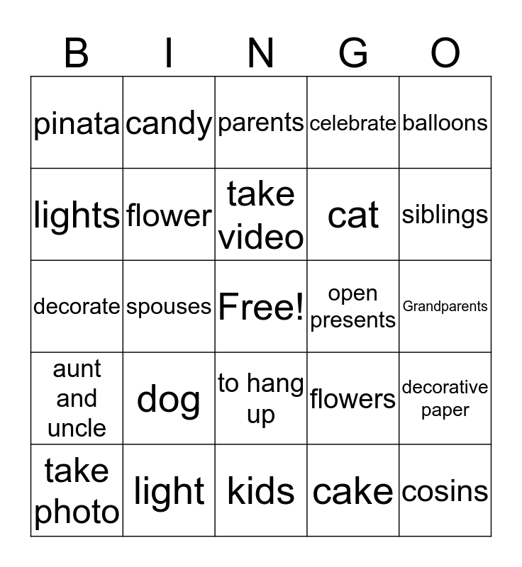 This bingo card has a free space and 24 words: dog, light, take video, take photo, balloons, pinata, lights, candy, open presents, to hang up, cat, decorate, flowers, decorative paper, flower, cake, Grandparents, parents, siblings, spouses, cosins, aunt and uncle, celebrate and kids.