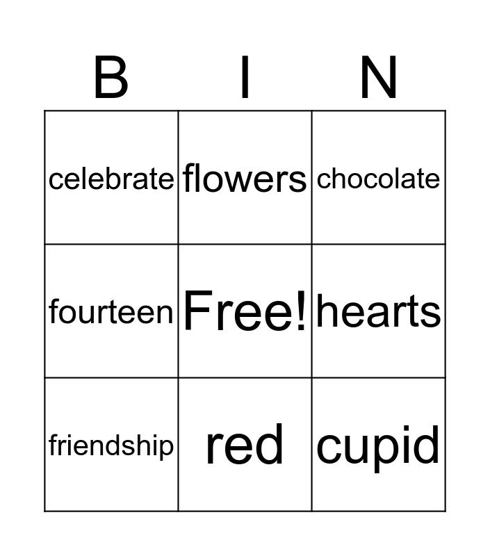 This bingo card has a free space and 11 words: party, red, cupid, friendship, flowers, chocolate, hearts, february, fourteen, celebrate and valenttine.
