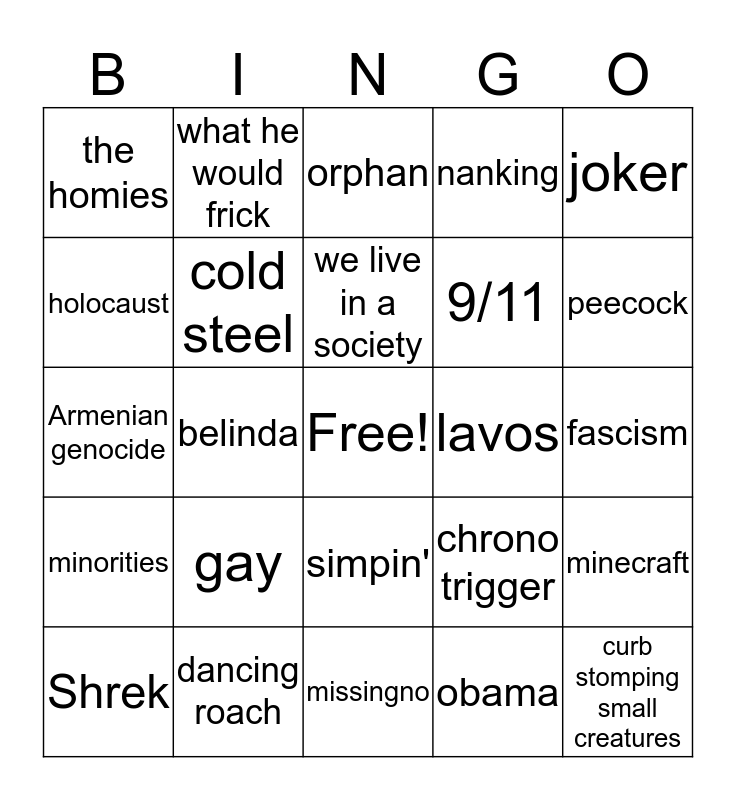 This bingo card has a free space and 24 words: gay, dancing roach, we live in a society, Shrek, joker, the homies, holocaust, what he would frick, lavos, simpin', 9/11, Armenian genocide, chrono trigger, minecraft, cold steel, obama, fascism, orphan, peecock, belinda, curb stomping small creatures, minorities, nanking and missingno.