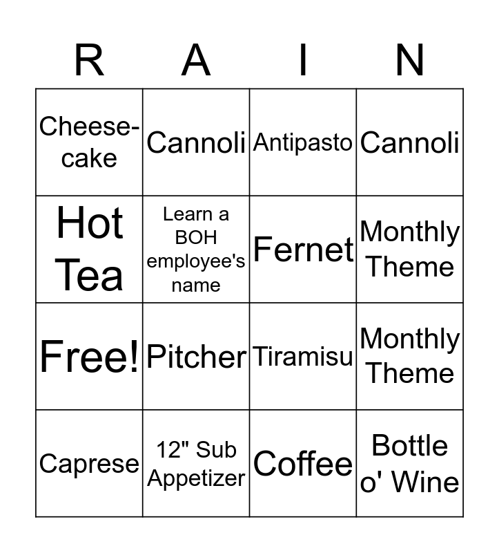 This bingo card has 19 words: Tiramisu, Monthly Theme, Antipasto, Bottle o' Wine, Monthly Theme, Hot Tea, Coffee, Cheese-cake, Cannoli, Free!, Pitcher, Learn a BOH employee's name, Fernet, 12" Sub Appetizer, Caprese, Pecan Porter, Cannoli, Monthly Theme and Fernet.