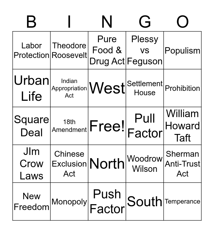 This bingo card has a free space and 26 words: North, South, West, Monopoly, Populism, Labor Protection, Urban Life, Theodore Roosevelt, William Howard Taft, Woodrow Wilson, Settlement House, Square Deal, Sherman Anti-Trust Act, New Freedom, 18th Amendment, 19th Amendment, Plessy vs Feguson, JIm Crow Laws, Pure Food & Drug Act, Temperance, Prohibition, Push Factor, Pull Factor, Chinese Exclusion Act, Indian Appropriation Act and NAACP.