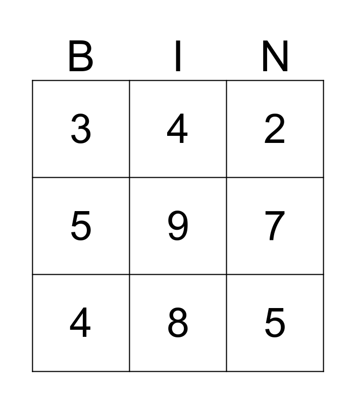 This bingo card has a free space and 12 words: 1, 3, 5, 7, 4, 2, 8, 6, 3, 5, 4 and 0.
