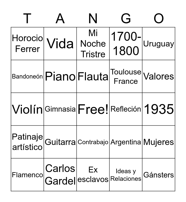 This bingo card has a free space and 24 words: Guitarra, Carlos Gardel, Flauta, Flamenco, Uruguay, Horocio Ferrer, Bandoneón, Vida, Refleción, Contrabajo, Toulouse France, Violín, Argentina, Mujeres, Piano, Ideas y Relaciones, 1935, Mi Noche Tristre, Valores, Gimnasia, Gánsters, Patinaje artístico, 1700-1800 and Ex esclavos.