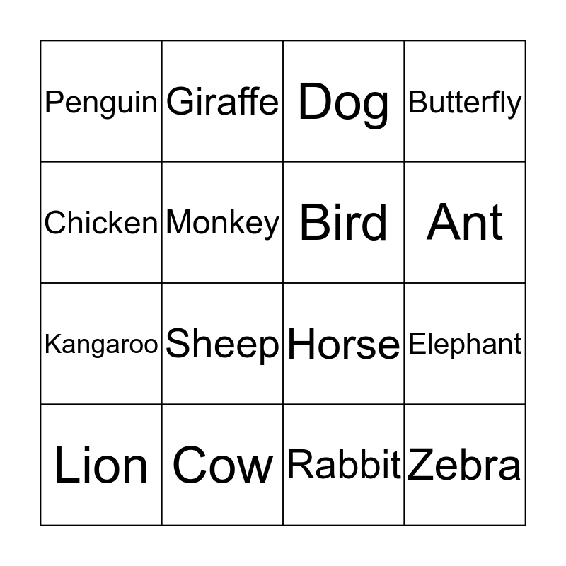 This bingo card has 20 words: Elephant, Mouse, Dog, Cat, Lion, Chicken, Cow, Penguin, Kangaroo, Giraffe, Sheep, Horse, Monkey, Zebra, Bird, Pig, Ant, Butterfly, Rabbit and Fish.