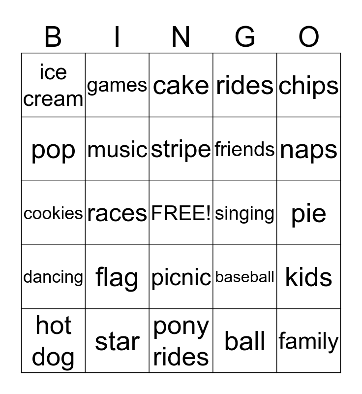 This bingo card has a free space and 24 words: flag, star, stripe, hot dog, chips, ice cream, pop, games, singing, picnic, friends, cookies, baseball, kids, music, ball, pie, cake, naps, races, family, dancing, rides and pony rides.