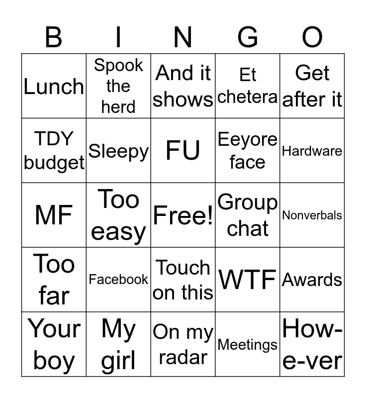 This bingo card has a free space and 24 words: Facebook, My girl, FU, Your boy, Get after it, Lunch, TDY budget, Spook the herd, Group chat, Touch on this, Eeyore face, MF, WTF, Awards, Sleepy, Meetings, Nonverbals, And it shows, Hardware, Too easy, How-e-ver, Too far, Et chetera and On my radar.