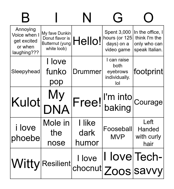 This bingo card has a free space and 24 words: Mole in the nose, Resilient, Drummer, Witty, In the office, I think I'm the only who can speak Italian., Annoying Voice when I get excited or when laughing???, Sleepyhead, My fave Dunkin Donut flavor is Butternut (yung white loob), I'm into baking, I like dark humor, I can raise both eyebrows individually. lol, Kulot, Fooseball MVP, Left Handed with curly hair, I love funko pop, I love Zoos, Courage, Hello!, footprint, My DNA, Tech-savvy, i love phoebe, Spent 3,000 hours (or 125 days) on a video game and I love chocnut.