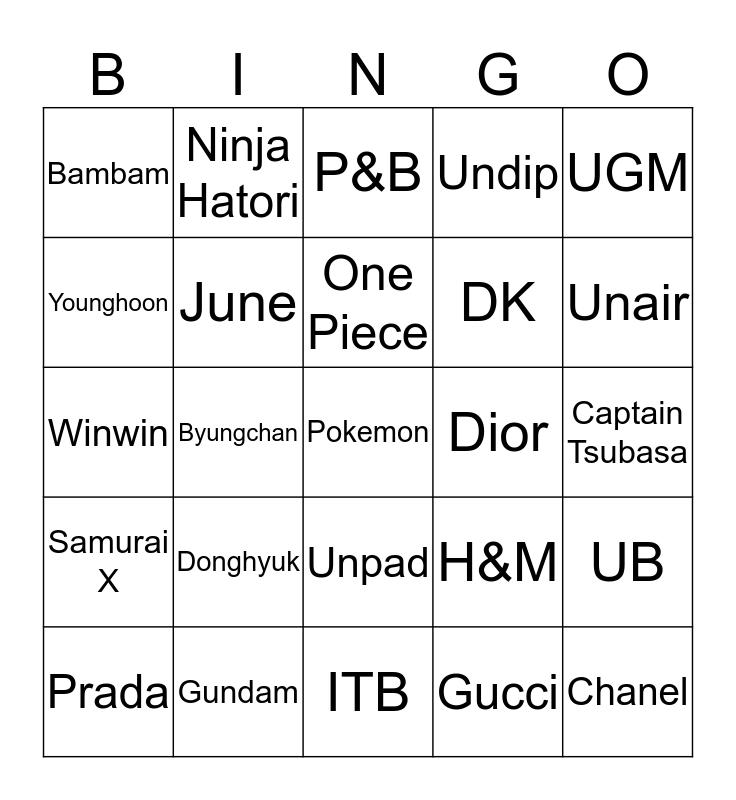 This bingo card has a free space and 24 words: Donghyuk, Gundam, One Piece, Prada, UGM, Bambam, Younghoon, Ninja Hatori, Dior, Unpad, DK, Winwin, H&M, UB, June, Gucci, Captain Tsubasa, P&B, Unair, Byungchan, Chanel, Samurai X, Undip and ITB.