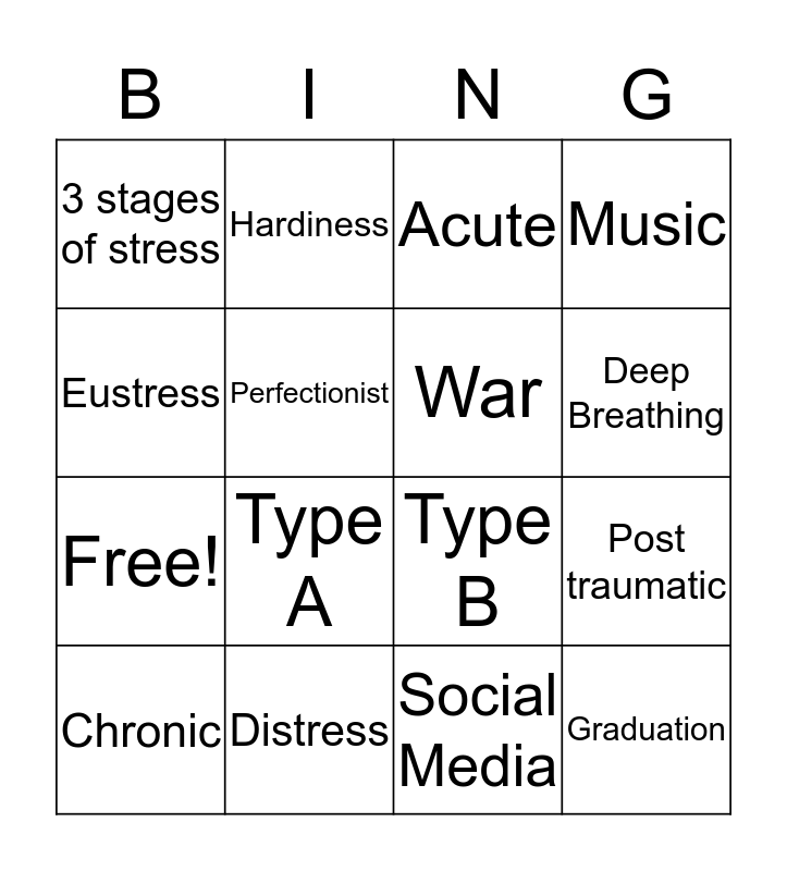 This bingo card has 20 words: Post traumatic, Homeostasis, Acute, Episodic, Chronic, Eustress, Distress, 3 stages of stress, Free!, Hardiness, Type A, Type B, Perfectionist, Graduation, War, Yoga, Deep Breathing, Music, Social Media and Abuse.