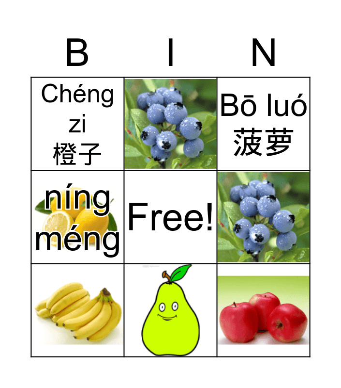 This bingo card has 8 images, a free space and 6 words: Cǎo méi 草莓, Chéng zi 橙子, níng méng, pú táo 葡萄, Chéng zi 橙子 and Bō luó 菠萝.