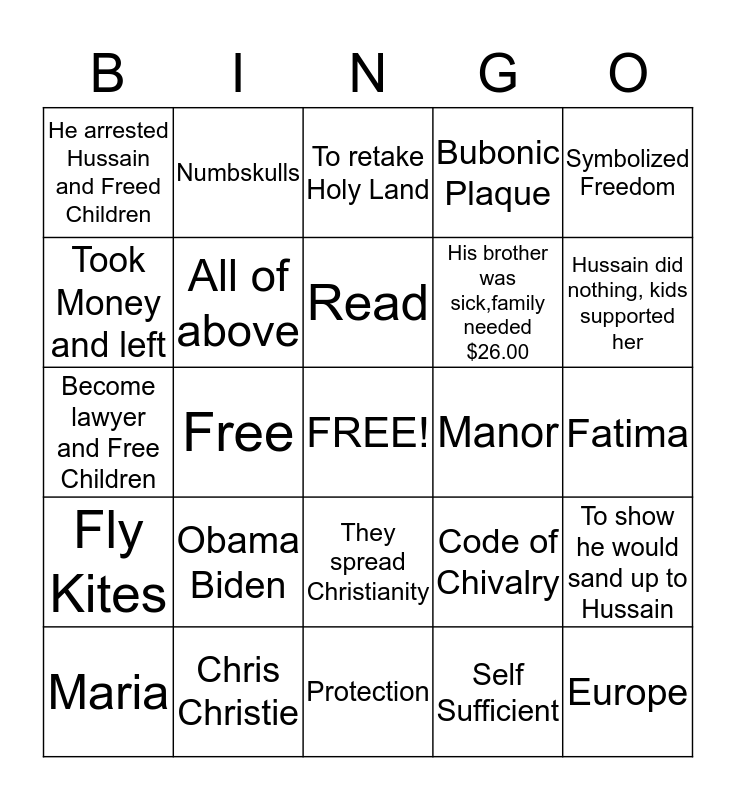 This bingo card has a free space and 24 words: Obama Biden, Chris Christie, Read, Maria, Symbolized Freedom, He arrested Hussain and Freed Children, Took Money and left, Numbskulls, Manor, They spread Christianity, His brother was sick,family needed $26.00, Become lawyer and Free Children, Code of Chivalry, To show he would sand up to Hussain, All of above, Self Sufficient, Fatima, To retake Holy Land, Hussain did nothing, kids supported her, Free, Europe, Fly Kites, Bubonic Plaque and Protection.