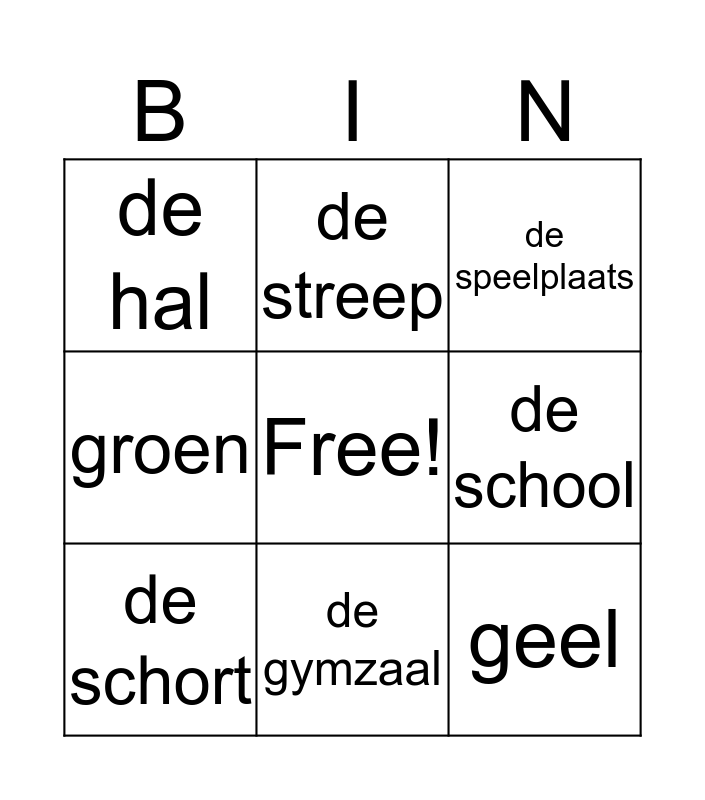 This bingo card has a free space and 14 words: de kwast, het schilderij, de schort, de streep, groen, geel, blauw, de gang, de gymzaal, de hal, de lerarenkamer, de school, de speelplaats and de wc.