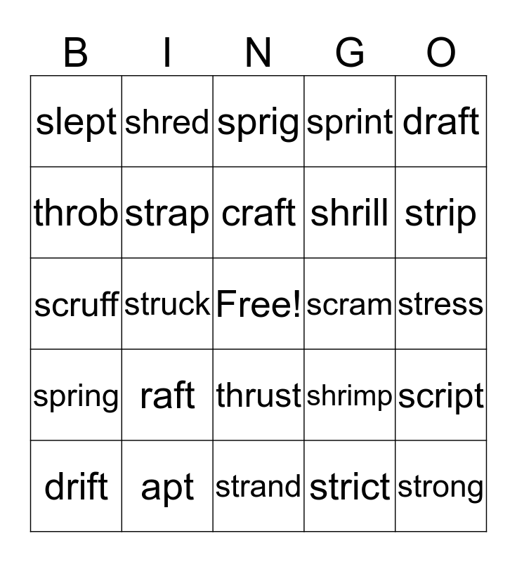 This bingo card has a free space and 24 words: raft, apt, craft, drift, draft, slept, throb, shred, scram, thrust, shrill, scruff, shrimp, script, strap, strict, stress, sprig, strip, struck, strong, spring, sprint and strand.