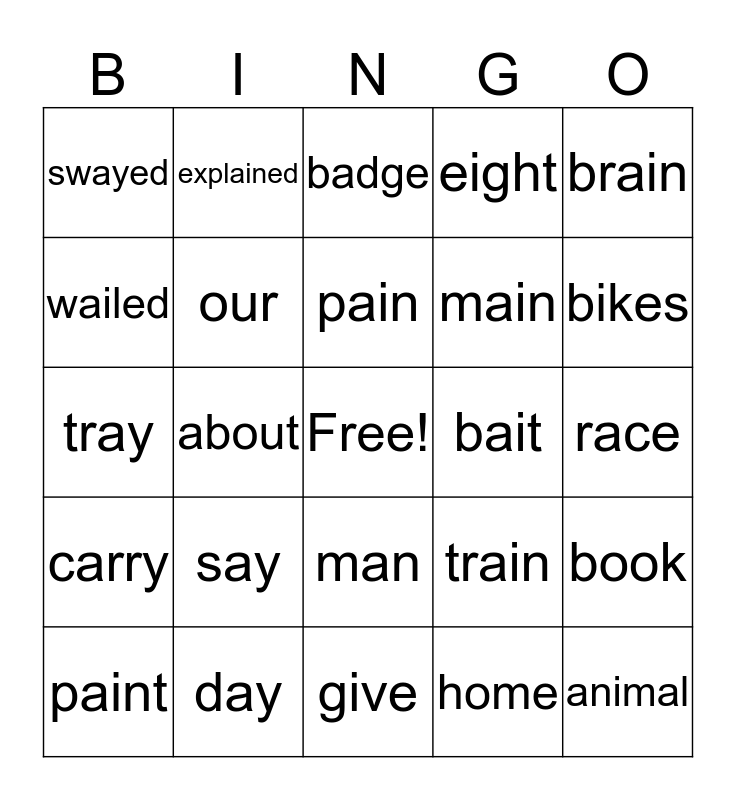 This bingo card has a free space and 24 words: say, day, pain, paint, brain, swayed, wailed, explained, bait, man, main, tray, train, book, our, home, race, badge, bikes, about, animal, carry, eight and give.