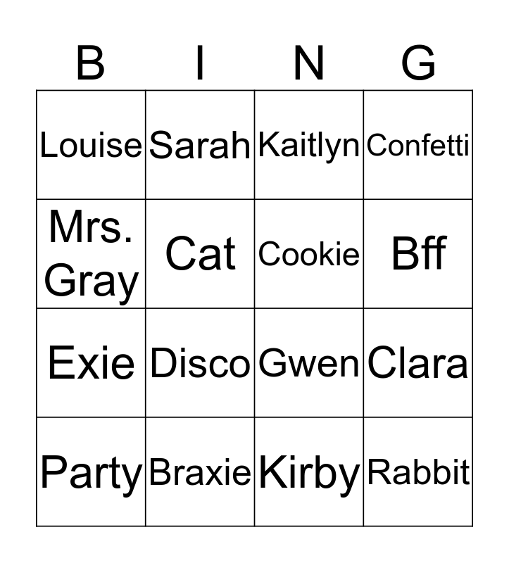 This bingo card has 16 words: Braxie, Clara, Kaitlyn, Louise, Exie, Sarah, Gwen, Kirby, Mrs. Gray, Cat, Party, Confetti, Disco, Bff, Cookie and Rabbit.