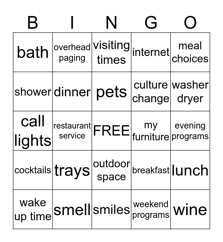 This bingo card has a free space and 24 words: trays, smell, pets, wake up time, meal choices, bath, shower, overhead paging, my furniture, outdoor space, culture change, call lights, breakfast, lunch, dinner, weekend programs, evening programs, visiting times, washer dryer, restaurant service, wine, cocktails, internet and smiles.