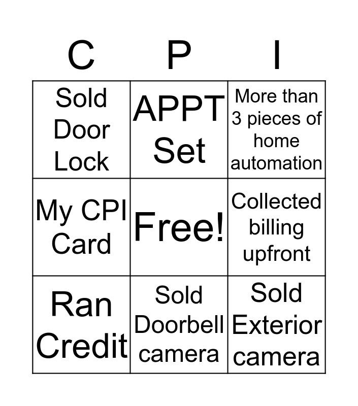 This bingo card has a free space and 14 words: Sold home automation, Upfront, Ran Credit, APPT Set, My CPI Card, Sold Exterior camera, Renter, Sold 795, Sold Doorbell camera, Sold Door Lock, Sold 599 package, Collected billing upfront, More than 3 pieces of home automation and Sold Mesh Network.