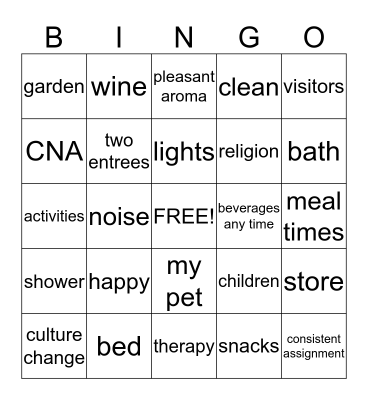 This bingo card has a free space and 24 words: happy, bed, lights, culture change, visitors, garden, CNA, wine, beverages any time, my pet, religion, activities, children, store, two entrees, snacks, meal times, pleasant aroma, bath, noise, consistent assignment, shower, clean and therapy.