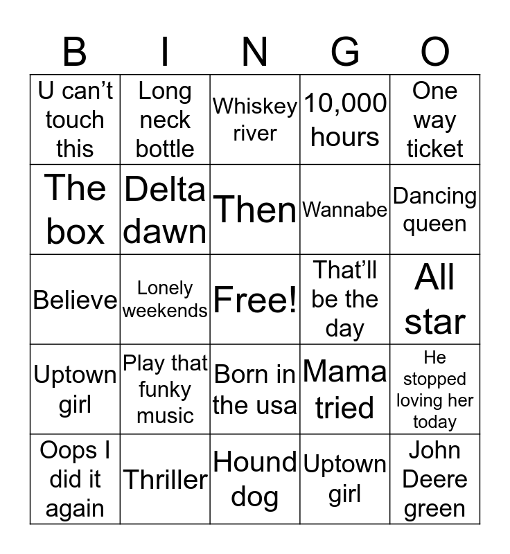 This bingo card has a free space and 77 words: Jolene, Yikes, Whiskey river, Livin on love, Take this job, Wild one, Blue, Here for the party, Alcohol, Beer never broke my heart, Old town road, On the other hand, Then, The box, Drink in my hand, Lonely weekends, Goodbye earl, John Deere green, Family tradition, One way ticket, Gone country, Believe, Delta dawn, Long neck bottle, 10,000 hours, She’s acting single, Jail house rock, Timber, Here comes the sun, I want it that way, Lonely, Speechless, Mamas don’t let your babies grow up to be cowboys, Mama tried, Dancing queen, Wannabe, Baby one more time, Girls just want to have fun, All star, Uptown girl, Bye bye bye, Sweet caroline, Jessie’s girl, Eye of the tiger, Livin on a prayer, Jump, Oops I did it again, U can’t touch this, Pour some sugar on me, Push it, Who let the dogs out, Born in the usa, Oh,pretty woman, Cotton eye joe, Love shack, Ain’t no mountain high enough, Sweet dreams, Beat it, Ice ice baby, Ymca, Play that funky music, 9 to 5, Stayin alive, Happy, Don’t stop believin, When doves cry, You shook me all night long, That’ll be the day, Hit me with your best shot, Peggy sue, Build me up buttercup, He stopped loving her today, Uptown girl, Thriller, Brown eyed girl, Hound dog and Material girl.