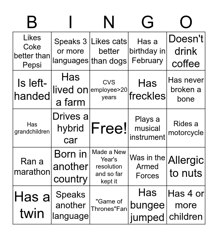 This bingo card has a free space and 24 words: Born in another country, Speaks another language, CVS employee>20 years, Has a twin, Doesn't drink coffee, Likes Coke better than Pepsi, Is left-handed, Speaks 3 or more languages, Plays a musical instrument, Made a New Year's resolution and so far kept it, Has freckles, Has grandchildren, Was in the Armed Forces, Allergic to nuts, Has lived on a farm, Has bungee jumped, Rides a motorcycle, Likes cats better than dogs, Has never broken a bone, Drives a hybrid car, Has 4 or more children, Ran a marathon, Has a birthday in February and "Game of Thrones"Fan.
