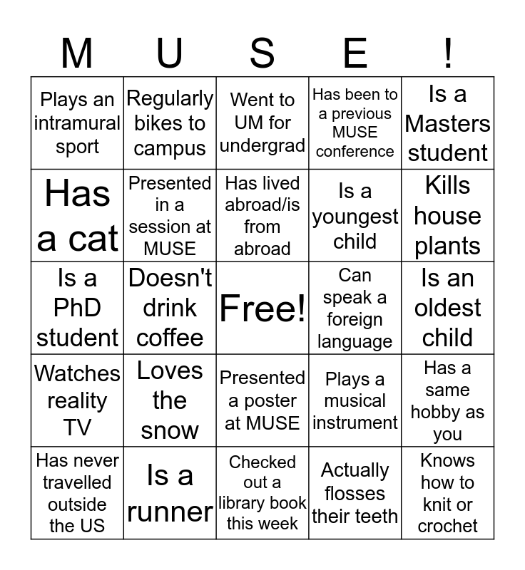 This bingo card has a free space and 35 words: Is from the West Coast, Is from MI, Can lick their elbow, Presented in a session at MUSE, Presented a poster at MUSE, Has been to a previous MUSE conference, Has a cat, Has a tattoo, Has lived abroad/is from abroad, Is an undergraduate student, Is a PhD student, Is a Masters student, Has a food allergy, Dislikes chocolate, Plays an intramural sport, Can speak a foreign language, Actually flosses their teeth, Doesn't drink coffee, Watches reality TV, Knows how to knit or crochet, Plays a musical instrument, Has never travelled outside the US, Has a same hobby as you, Is a runner, Went to UM for undergrad, Kills house plants, Is a night owl, Is an early bird, Is a youngest child, Is an oldest child, Has a dog, Checked out a library book this week, Loves the snow, Regularly bikes to campus and Is on the MUSE organizing committee.