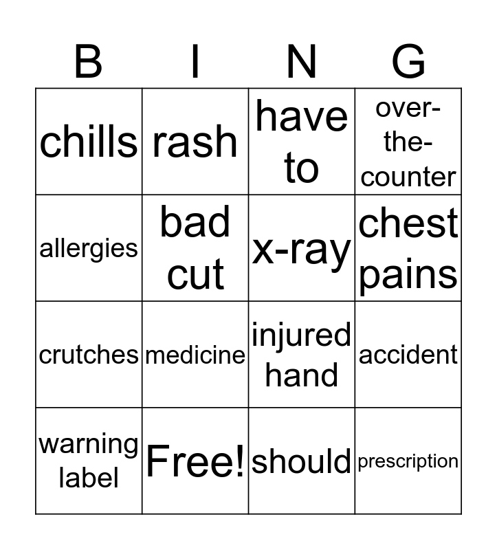 This bingo card has 24 words: swollen knee, sprained wrist, chest pains, high blood pressure, allergies, chills, bad cut, rash, Free!, stiff neck, crutches, injured hand, sprained ankle, inhaler, x-ray, painful knee, should, have to, medicine, accident, warning label, prescription, over-the-counter and ladder.
