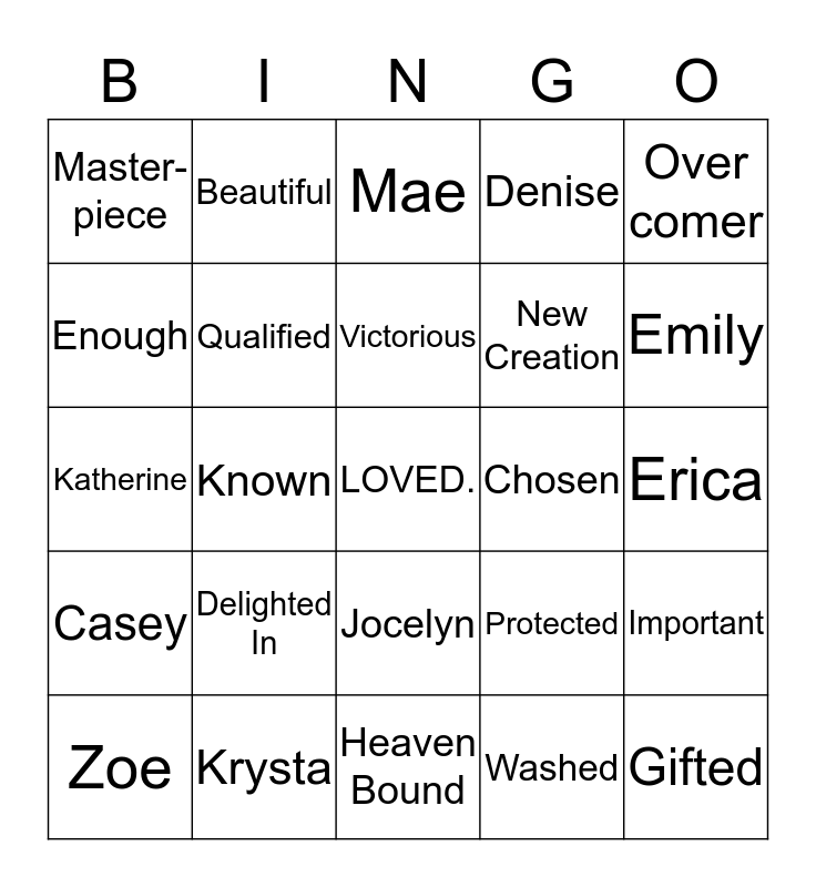 This bingo card has a free space and 52 words: Accepted, Gifted, Temple, Heaven Bound, Delighted In, Rescued, Beautiful, Unique, Enough, Strong, Qualified, Jewel, Important, Protected, eXample, Free, Victorious, Chosen, Young and Able, Over comer, Known, Washed, Master- piece, New Creation, Zealous, Monique, Pat, Vania, Emily, Becky, Stephanie, Denise, Essence, Peace, Mae, Mae, Krysta, Kelly, Chelsea, Helen, Amanda, Erica, Casey, Gracie, Jocelyn, Jackie, Juliana, Katherine, Brenda, Lailaunni, Zoe and Mary.