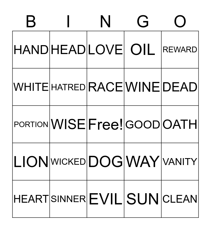 This bingo card has a free space and 29 words: HEART, DECLARE, WISE, WORKS, HAND, LOVE, HATRED, WICKED, GOOD, SINNER, OATH, CLEAN, EVIL, SUN, DEAD, HOPE, DOG, LION, REWARD, PORTION, WAY, BREAD, WINE, WHITE, OIL, HEAD, VANITY, RACE and BATTLE.