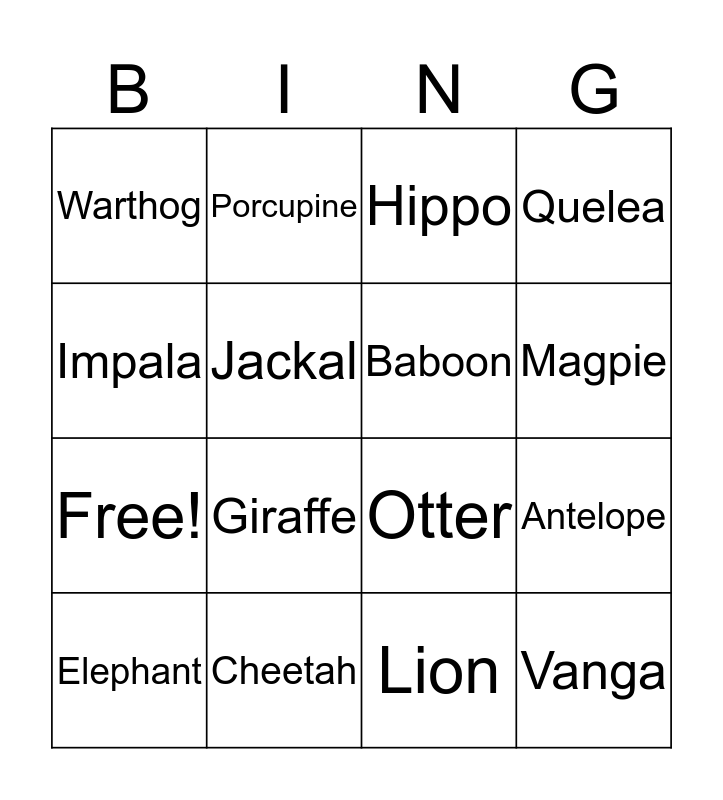 This bingo card has 20 words: Elephant, Mongoose, Hippo, Antelope, Rhinoceros, Giraffe, Lion, Quelea, Free!, Porcupine, Otter, Magpie, Warthog, Cheetah, Baboon, Fox, Impala, Jackal, Topi and Vanga.