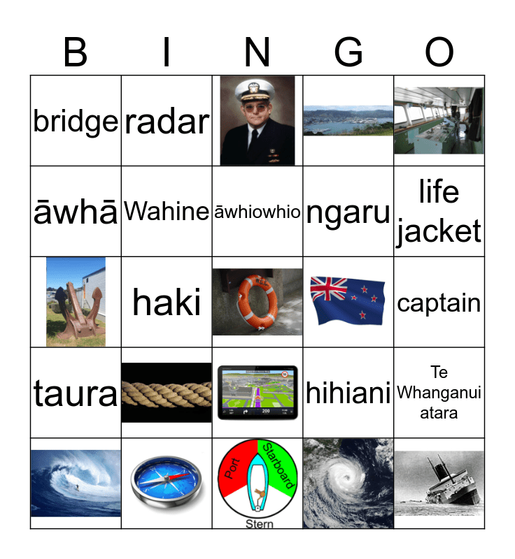 This bingo card has 18 images, a free space and 26 words: rope, life jacket, radar, compass, flag, bridge, lifebuoy, captain, lifeboat, Wahanga kaipuke, hihiani, taura, Rangatira, Te Whanganui atara, Puahe ora, kāpehu, haki, Pūnaha kimi Taunga, Kahu kautere, arawhata, āwhiowhio, āwhā, ngaru, Haika, Wahine and Huirere.