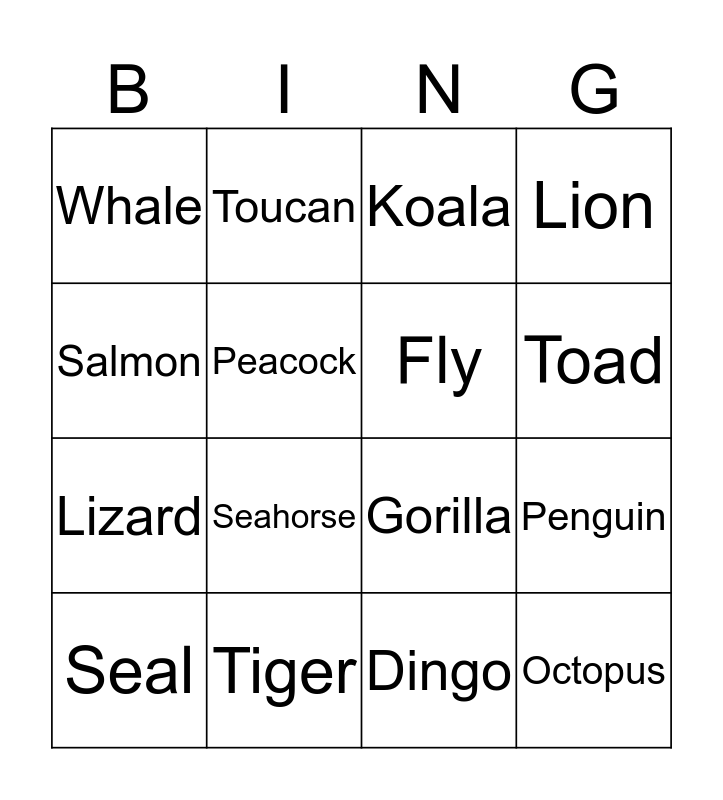 This bingo card has 16 words: Tiger, Penguin, Koala, Whale, Lizard, Toucan, Gorilla, Dingo, Salmon, Peacock, Seal, Lion, Seahorse, Toad, Fly and Octopus.