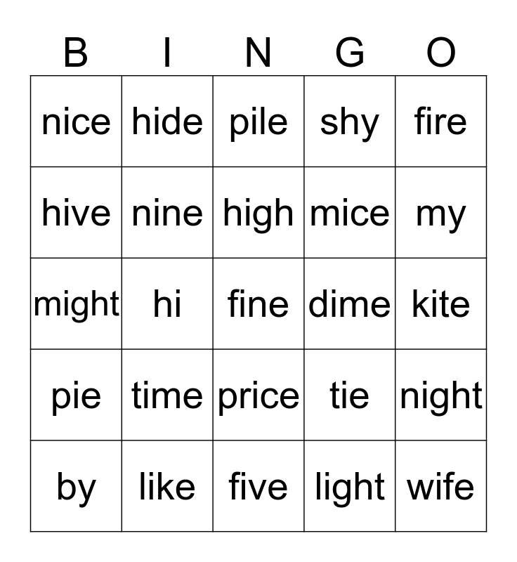 This bingo card has 25 words: pie, like, fine, light, fire, nice, hide, pile, dime, night, hive, nine, five, tie, my, by, hi, high, mice, kite, might, time, price, shy and wife.