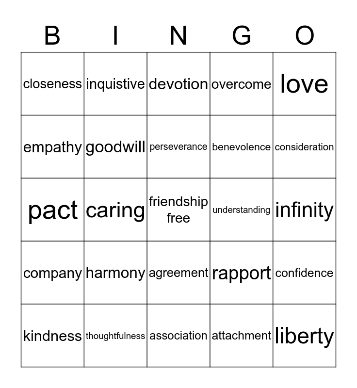 This bingo card has a free space and 29 words: kindness, compassion, caring, affection, closeness, devotion, goodwill, harmony, understanding, thoughtfulness, infinity, liberty, association, attachment, consideration, accord, agreement, company, love, pact, rapport, amity, benevolence, empathy, overcome, inquistive, confidence, perseverance and awareness.