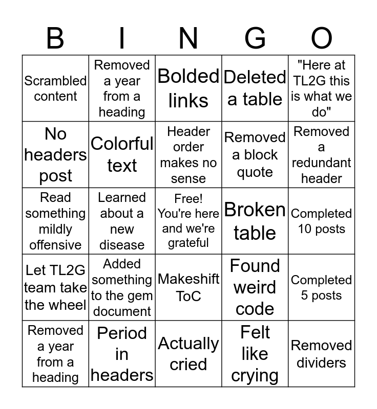 This bingo card has a free space and 24 words: Added something to the gem document, Period in headers, Header order makes no sense, Removed a year from a heading, "Here at TL2G this is what we do", Scrambled content, No headers post, Removed a year from a heading, Broken table, Makeshift ToC, Removed a block quote, Read something mildly offensive, Found weird code, Completed 5 posts, Colorful text, Felt like crying, Completed 10 posts, Bolded links, Removed a redundant header, Learned about a new disease, Removed dividers, Let TL2G team take the wheel, Deleted a table and Actually cried.