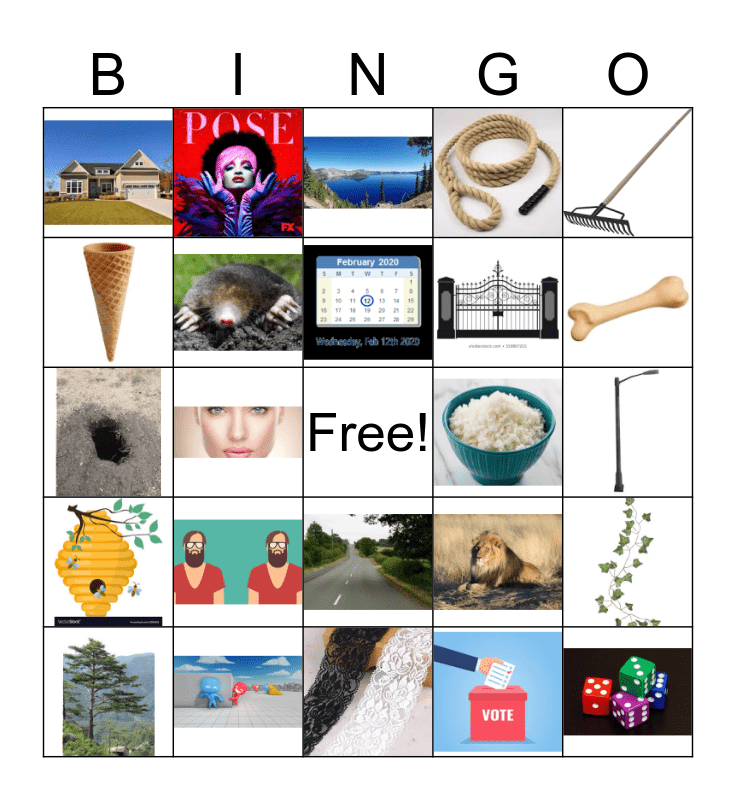 This bingo card has 28 images and a free space.