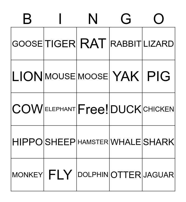 This bingo card has a free space and 39 words: CAT, DOG, PLATYPUS, WHALE, SHARK, HIPPO, ELEPHANT, RHINO, DUCK, CHICKEN, LION, TIGER, TURTLE, PIG, COW, SHEEP, HAMSTER, RABBIT, OWL, MONKEY, MOUSE, MOOSE, OTTER, LIZARD, GECKO, FLY, DOLPHIN, ORCA, FISH, GOOSE, PANDA, GOPHER, YAK, JAGUAR, TURKEY, GERBIL, RAT, BAT and LLAMA.