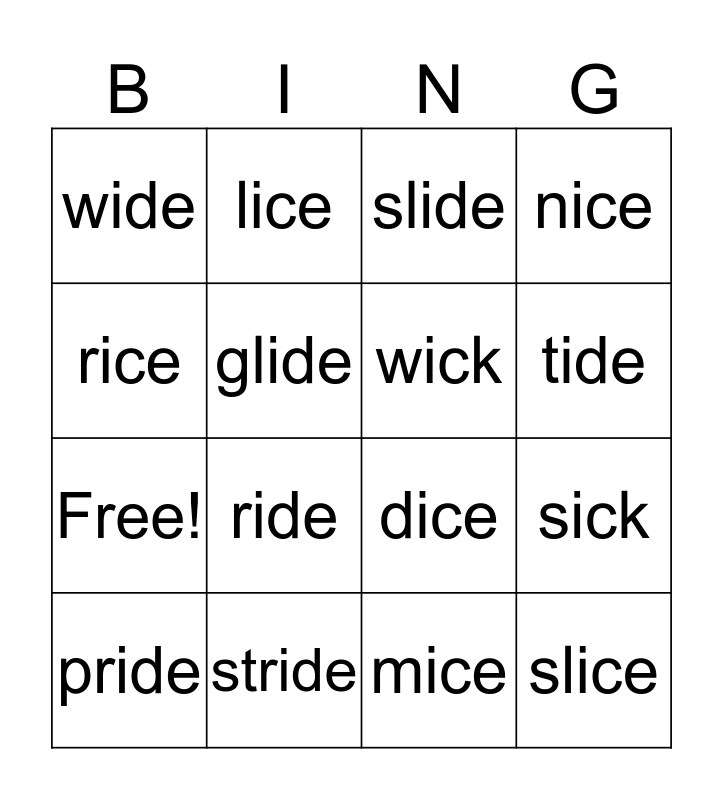 This bingo card has 26 words: Free!, hide, ride, side, tide, wide, glide, slide, bride, pride, stride, wick, tick, lick, nick, stick, nice, rice, lice, dice, slice, brick, price, mice, sick and trick.