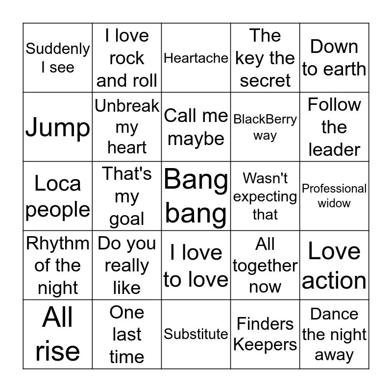 This bingo card has a free space and 44 words: Stay, Do you really like, Start, Finders Keepers, Finally, There must be an angel, Unbreak my heart, Shackles, The key the secret, Dance the night away, Suddenly I see, One last time, All together now, Professional widow, Video killed the radio Star, Broken, Substitute, Wasn't expecting that, 30-minute love affair, Loca people, I love rock and roll, I love to love, My prerogative, Down to earth, Oliver's army, Living next door to Alice, Call me maybe, Recovery, Love action, All rise, Milkshake, Heartache, Brimful of asha, Got to get, Rhythm of the night, Change, Easy lover, Your history, Follow the leader, Jump, That's my goal, Party rock anthem, BlackBerry way and China in your hand.