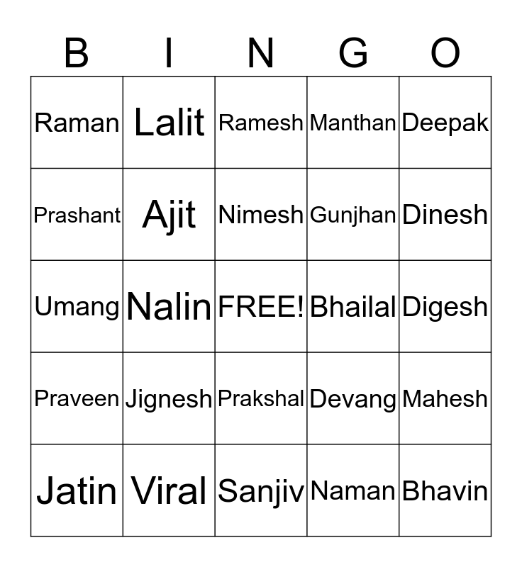 This bingo card has a free space and 32 words: Naman, Jeetu, Nalin, Poras, Praveen, Ajit, Deepak, Mahesh, Lalit, Apoorva, Nimesh, Ramesh, Yogesh, Supan, Bhailal, Rasik, Jatin, Umang, Prakshal, Jignesh, Devang, Pankaj, Digesh, Viral, Bhavin, Manthan, Gunjhan, Prashant, Raman, Sanjiv, Jainish and Dinesh.