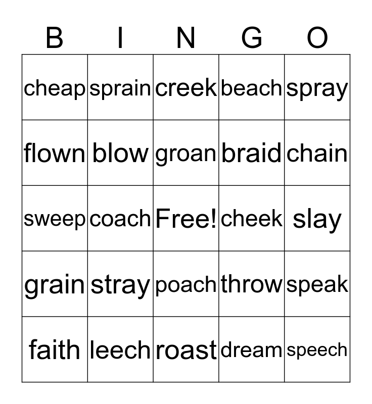 This bingo card has a free space and 24 words: stray, leech, groan, faith, spray, cheap, flown, sprain, cheek, poach, braid, sweep, throw, speak, blow, dream, slay, creek, chain, coach, speech, grain, beach and roast.