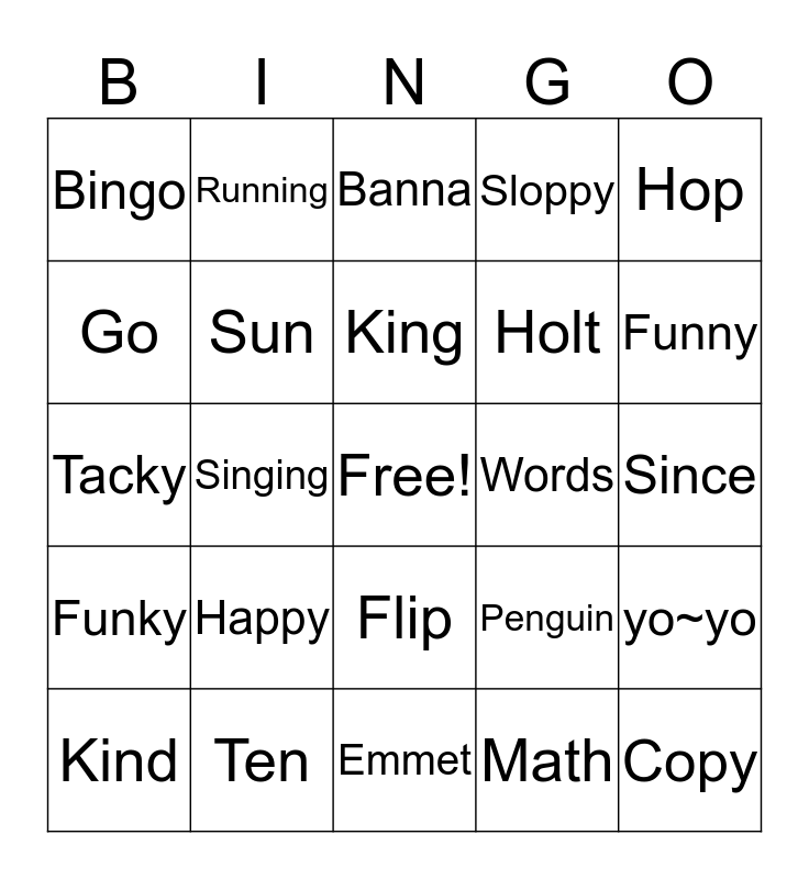 This bingo card has a free space and 24 words: Happy, Ten, King, Kind, Hop, Bingo, Go, Running, Words, Flip, Holt, Tacky, Penguin, yo~yo, Sun, Math, Since, Banna, Funny, Singing, Copy, Funky, Sloppy and Emmet.