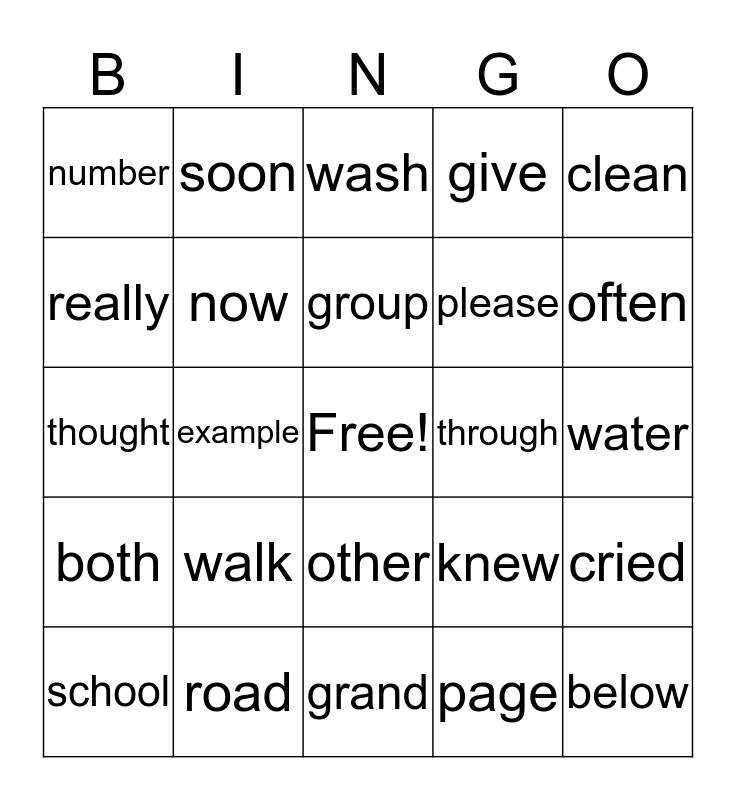 This bingo card has a free space and 24 words: walk, road, group, school, clean, number, really, soon, through, other, please, thought, knew, cried, now, page, water, wash, often, example, below, both, give and grand.
