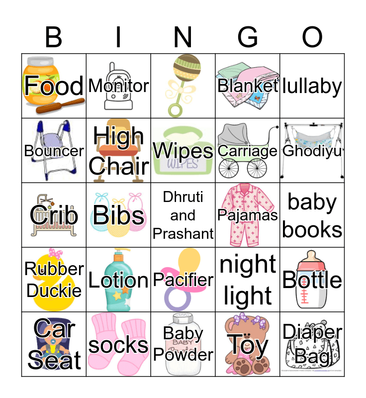 This bingo card has 24 images, a free space and 27 words: Bottle, Teething Ring, Carriage, Toy, Bouncer, Monitor, Rubber Duckie, Pajamas, Car Seat, Crib, Blanket, socks, Baby Powder, Ghodiyu, Diapers, Lotion, High Chair, Wipes, Pacifier, Food, Changing Table, Diaper Bag, Bibs, baby books, night light, lullaby and bassinet.
