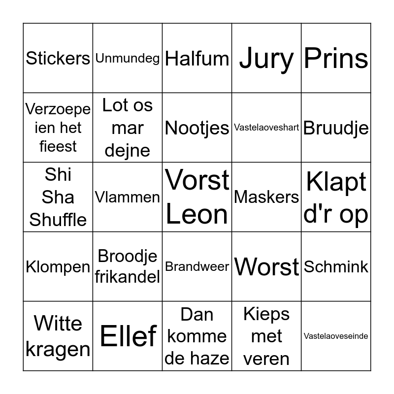 This bingo card has a free space and 34 words: Superschottelslet, Blieve gaon, 1000 sterre, Stuuterbal, Klapt d'r op, Verzoepe ien het fieest, Lot os mar dejne, Dan komme de haze, Vastelaoveshart, Vastelaoveseinde, Shi Sha Shuffle, Unmundeg, Kieps met veren, 10 Bier, Klompen, Vlammen, Brandweer, Maskers, Schmink, Witte kragen, Ellef, Pielhaas, Jury, Bruudje, Rood-Geel-Groen, Broodje frikandel, Halfum, Zoee doen weej dat!, Prins, Stickers, Hofband, Nootjes, Worst and Schoefele, schoefele.