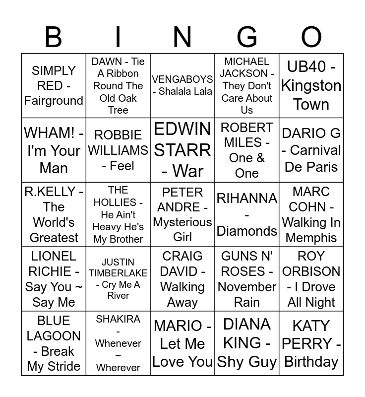 This bingo card has 45 words: NO MERCY - Where Do You Go, PETER ANDRE - Mysterious Girl, MR.PRESIDENT - Coco Jambo, BLUE LAGOON - Break My Stride, RICKY MARTIN - Livin La Vida Loca, DIANA KING - Shy Guy, VENGABOYS - Shalala Lala, SANTANA - Maria Maria, UB40 - Kingston Town, SHAKIRA - Whenever ~ Wherever, MICHAEL JACKSON - They Don't Care About Us, RIHANNA - Diamonds, CRAIG DAVID - Walking Away, JUSTIN TIMBERLAKE - Cry Me A River, LUTHER VANDROSS - Never Too Much, MARIO - Let Me Love You, EAST 17 & GABRIELLE - If You Ever, R.KELLY - The World's Greatest, USHER - You Remind Me, DARIO G - Carnival De Paris, DAWN - Tie A Ribbon Round The Old Oak Tree, MADONNA - Papa Don't Preach, THE PASADENAS - I'm Doing Fine Now, SIMPLY RED - Fairground, PHIL LYNOTT - Old Town, MARC COHN - Walking In Memphis, OASIS - Live Forever, BILLIE JO SPEARS - Blanket On The Ground, GUNS N' ROSES - November Rain, LIONEL RICHIE - Say You ~ Say Me, THE RIGHTEOUS BROTHERS - Unchained Melody, ROY ORBISON - I Drove All Night, VANESSA AMOROSI - Absolutely Everybody, BONNIE TYLER - Total Eclipse Of The Heart, REPUBLICA - Ready To Go, THE HOLLIES - He Ain't Heavy He's My Brother, SAM SMITH - Stay With Me, RITA ORA - I Will Never Let You Down, KATY PERRY - Birthday, EDWIN STARR - War, WHAM! - I'm Your Man, ROBERT MILES - One & One, P!NK - Raise Your Glass, ROBBIE WILLIAMS - Feel and LILY ALLEN - Not Fair.
