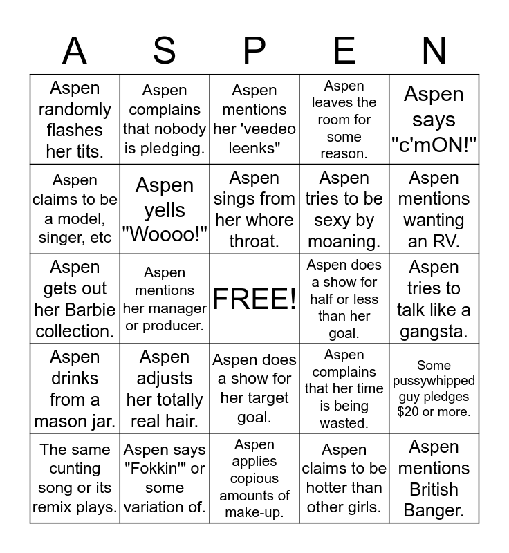 This bingo card has a free space and 24 words: Aspen adjusts her totally real hair., Aspen says "Fokkin'" or some variation of., Aspen sings from her whore throat., The same cunting song or its remix plays., Aspen says "c'mON!", Aspen randomly flashes her tits., Aspen claims to be a model, singer, etc, Aspen complains that nobody is pledging., Aspen does a show for half or less than her goal., Aspen does a show for her target goal., Aspen tries to be sexy by moaning., Aspen gets out her Barbie collection., Aspen complains that her time is being wasted., Some pussywhipped guy pledges $20 or more., Aspen yells "Woooo!", Aspen claims to be hotter than other girls., Aspen tries to talk like a gangsta., Aspen mentions her 'veedeo leenks", Aspen mentions wanting an RV., Aspen mentions her manager or producer., Aspen mentions British Banger., Aspen drinks from a mason jar., Aspen leaves the room for some reason. and Aspen applies copious amounts of make-up..