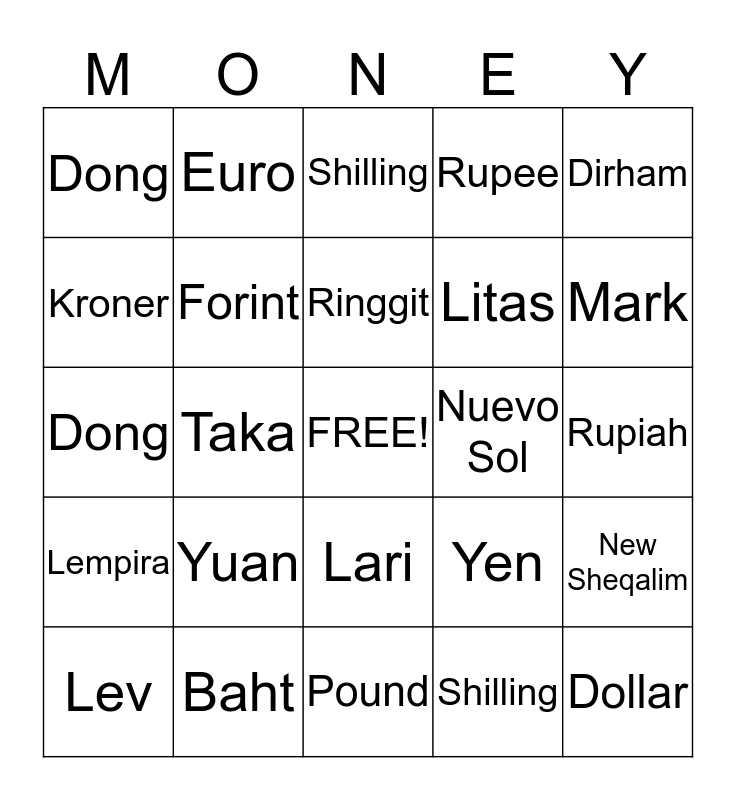 This bingo card has a free space and 46 words: Peso, Dollar, Real, Pound, Yuan, Colon, Euro, Koruna, Kroner, Quetzal, Forint, Rupee, New Sheqalim, Yen, Dinar, Won, Ringgit, Nuevo Sol, Piso, Dirham, Taka, Shilling, Dong, Litas, Boliviano, Mark, Lev, Birr, Lari, Lempira, Rufiyaa, Kina, Ruble, Rand, Franc, Baht, Rupiah, Dirham, Taka, Zloty, Tala, Shilling, Dong, Kwacha, Leu and Litas.