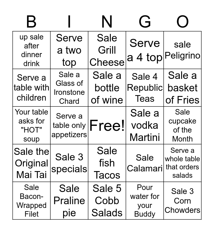 This bingo card has a free space and 24 words: Sale 3 specials, Sale Praline pie, Sale a bottle of wine, Sale Bacon-Wrapped Filet, sale Peligrino, up sale after dinner drink, Serve a table with children, Serve a two top, Sale a vodka Martini, Sale fish Tacos, Sale 4 Republic Teas, Your table asks for "HOT" soup, Sale Calamari, Serve a whole table that orders salads, Sale a Glass of Ironstone Chard, Pour water for your Buddy, Sale cupcake of the Month, Sale Grill Cheese, Sale a basket of Fries, Serve a table only appetizers, Sale 3 Corn Chowders, Sale the Original Mai Tai, Serve a 4 top and Sale 5 Cobb Salads.