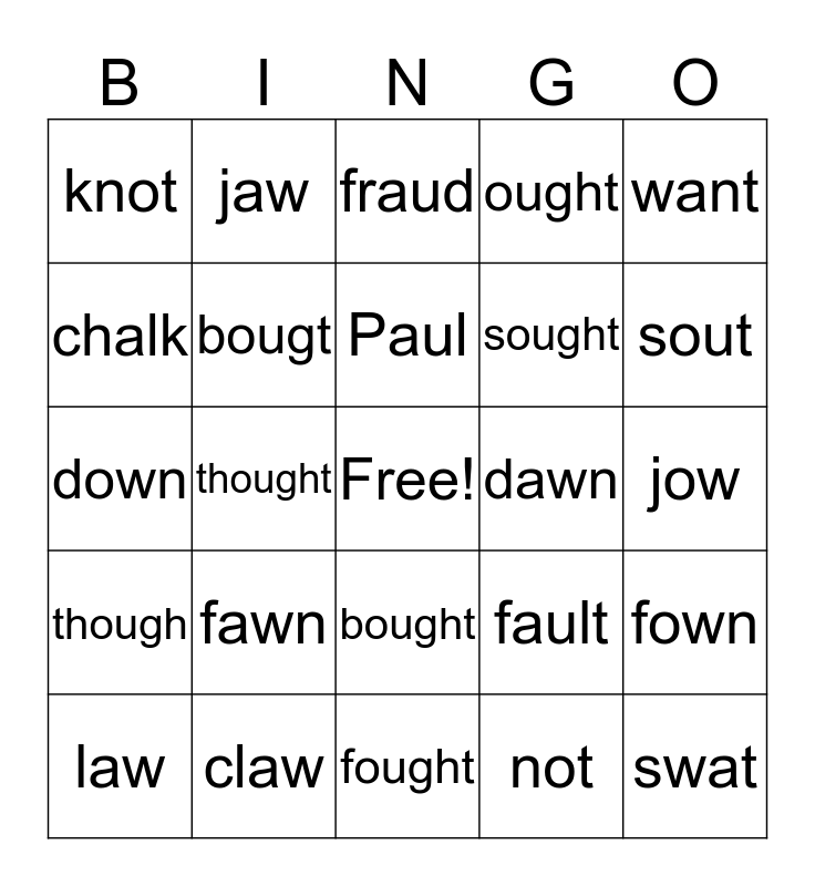 This bingo card has a free space and 24 words: fawn, claw, Paul, law, want, knot, chalk, jaw, dawn, bought, sought, down, fault, fown, bougt, not, jow, fraud, sout, thought, swat, though, ought and fought.