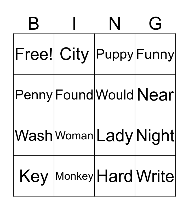 This bingo card has 16 words: Key, Monkey, Puppy, Funny, Penny, City, Lady, Night, Free!, Found, Hard, Near, Wash, Woman, Would and Write.